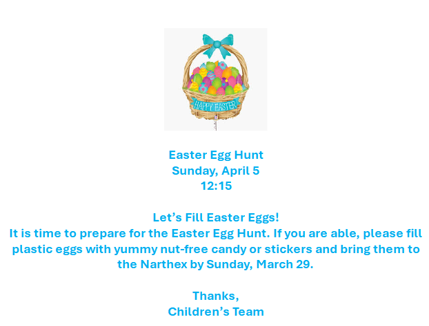 Join us after worship on Easter Sunday. No need to bring anything other than a basket!